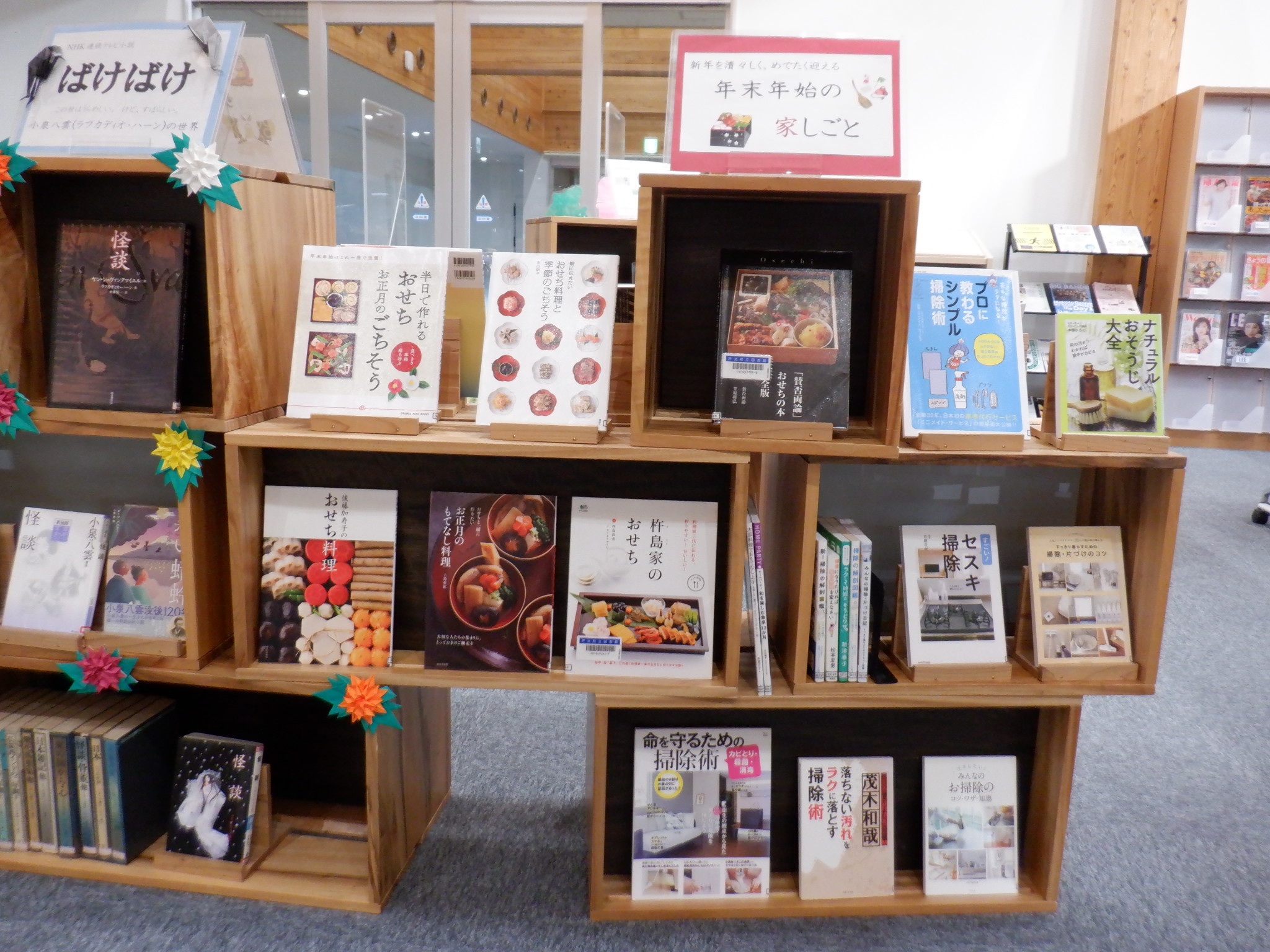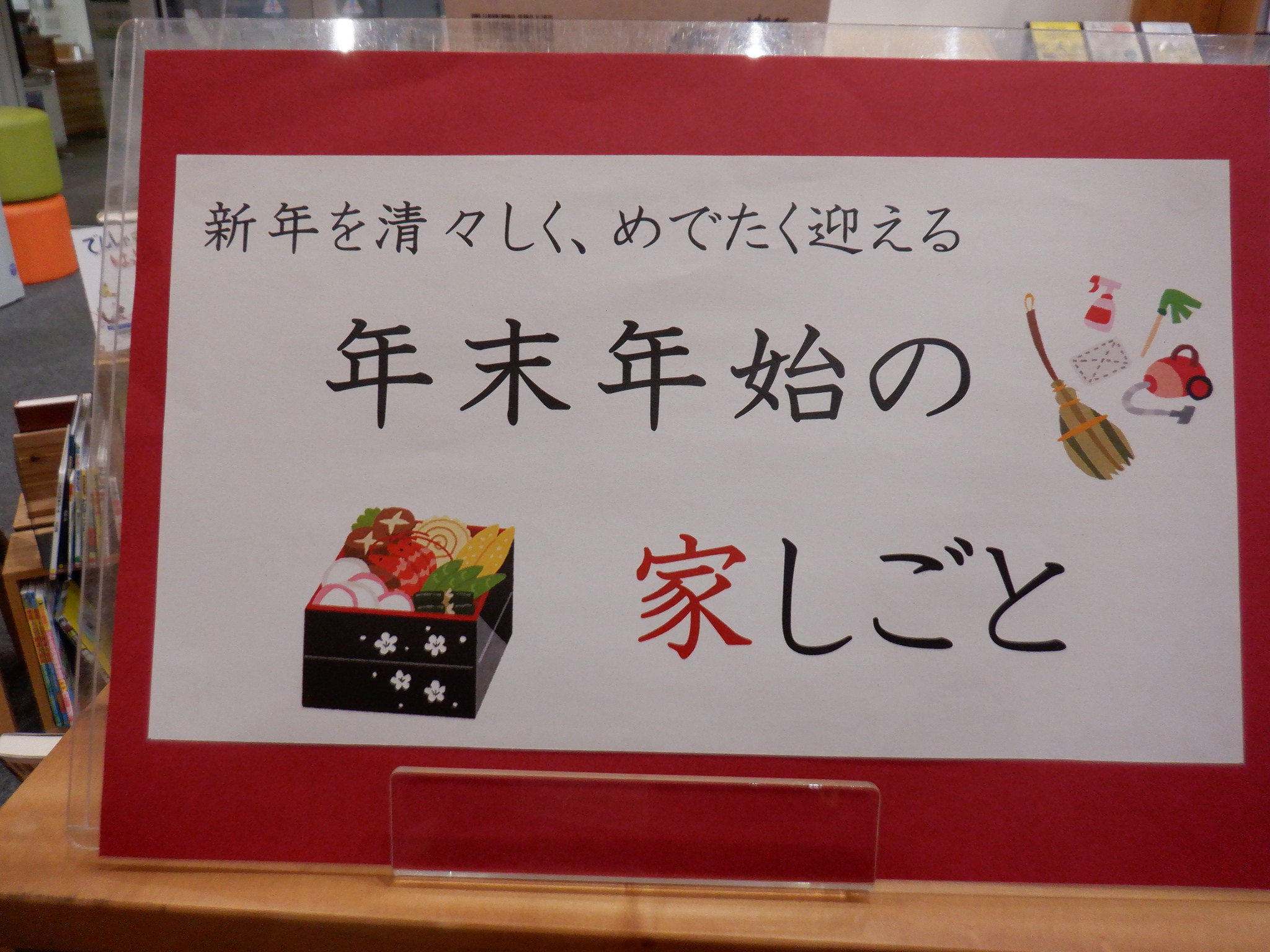 図書館では、「新年を清々しく、めでたく迎える 年末年始の家しごと」と題し、特集展示をしています。短時間でピカピカになる掃除の裏ワザや、おいしいおせちやおもてなし料理のレシピをそろえ、忙しい年末年始をお手伝いします。