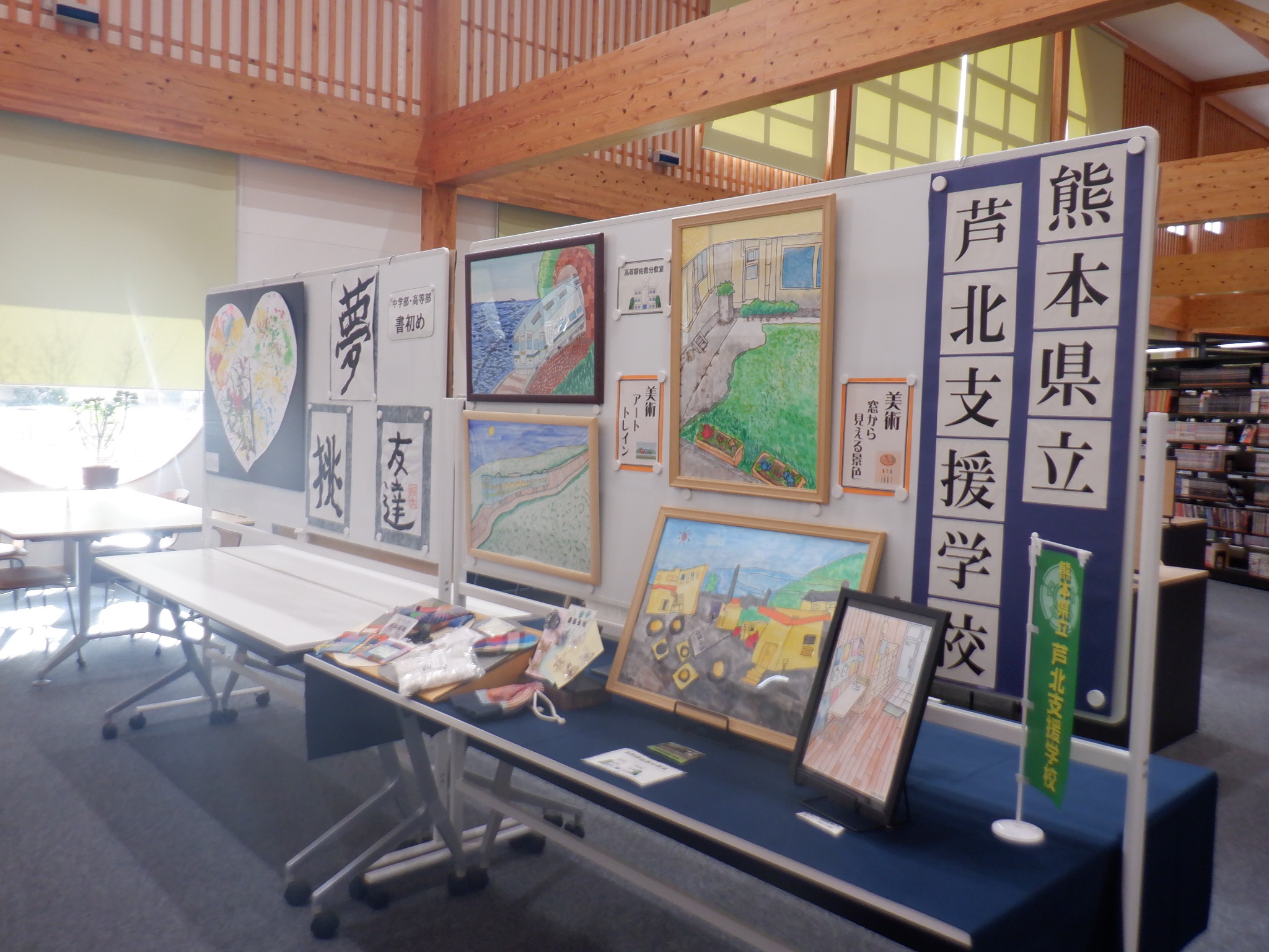 図書館では、芦北支援学校生徒さんによる作品展を開催しています。