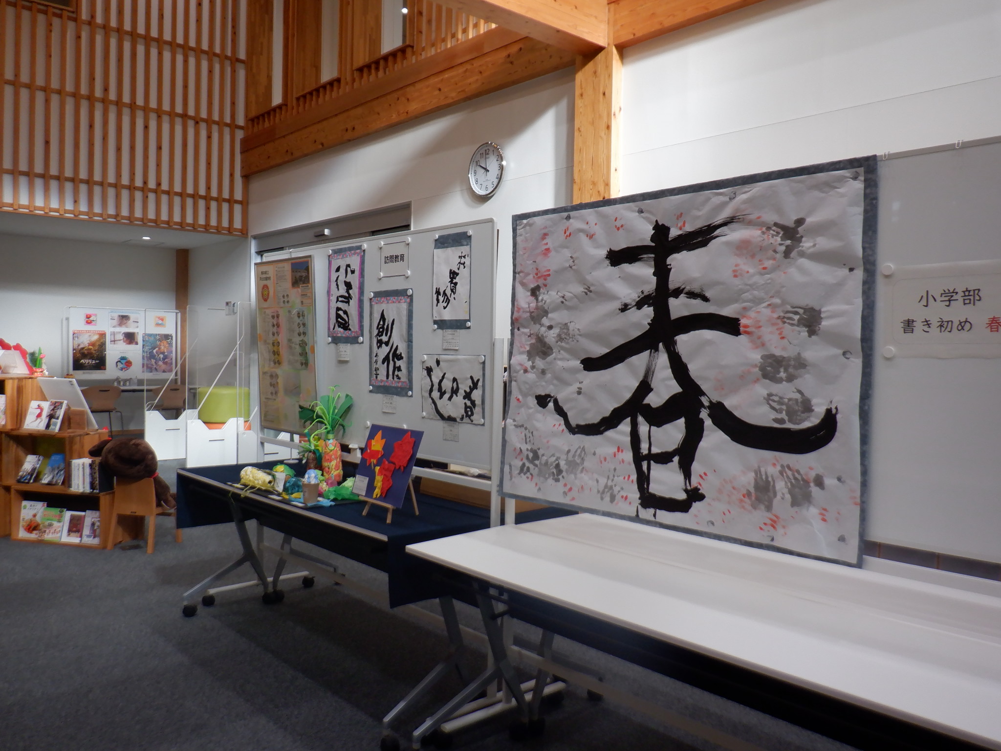書初め、紙粘土を使った作品、農園・手工・紙工芸品等を展示中です。
