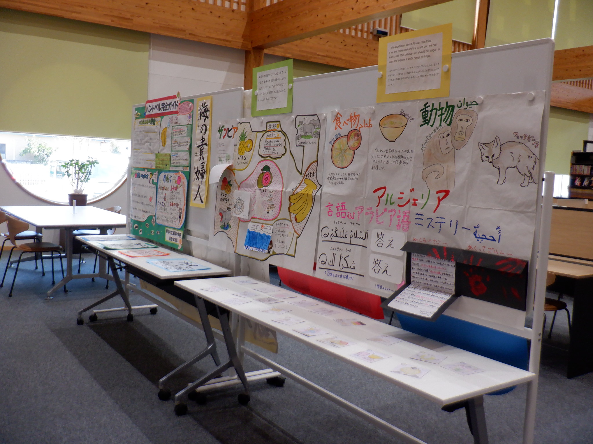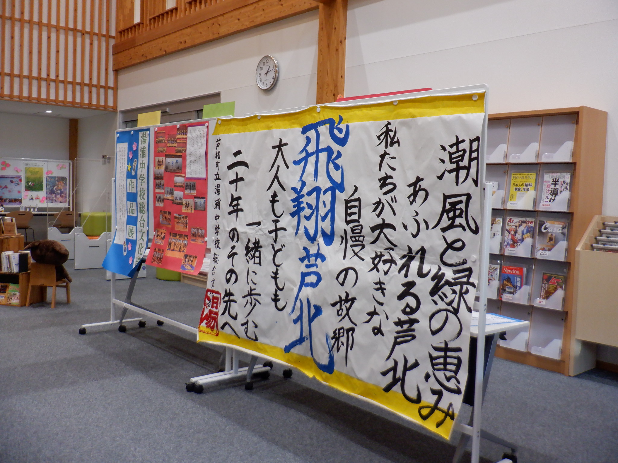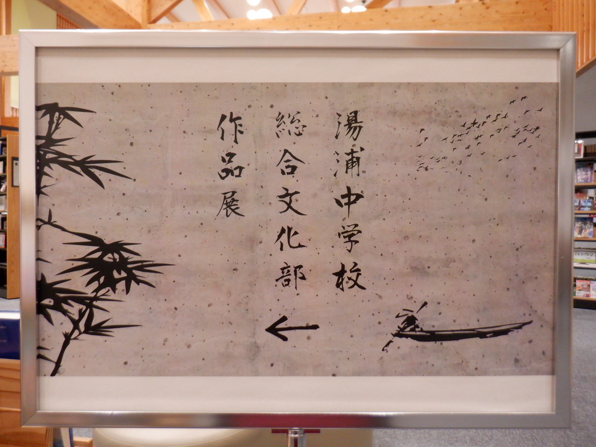 湯浦中学校 総合文化部、生徒さん、先生方の活動、作品を図書館内で展示しています。